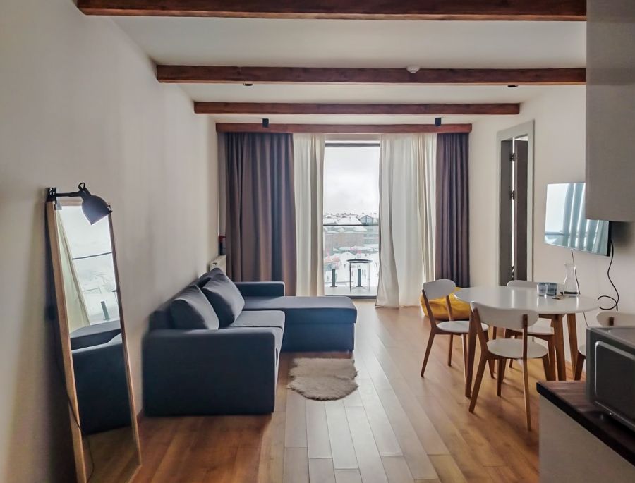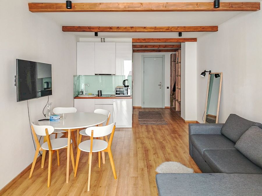 1 room, 1 double bed, 1 sofa bed for two adults, Linen, Towels, Kitchen, Refrigerator, Kettle, Cooker, Microwave, Dishwasher, Hairdryer, 1 bathroom with shower and toilet, TV, WI-FI, Balcony, Non-smoking rooms, Self check-in possible