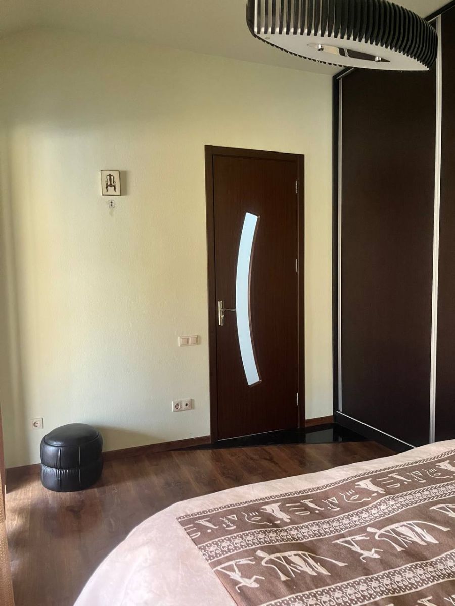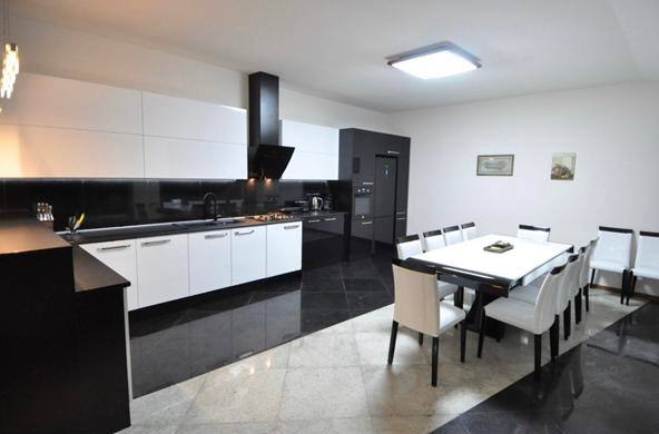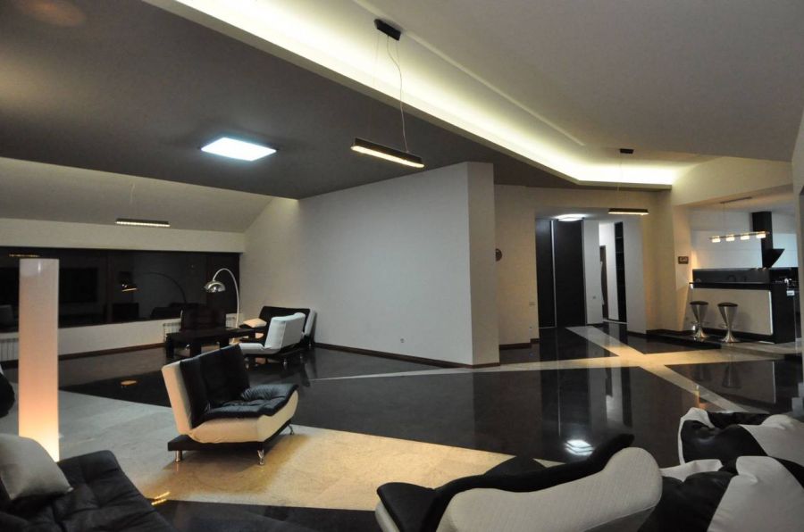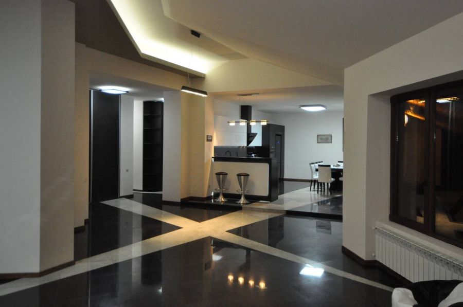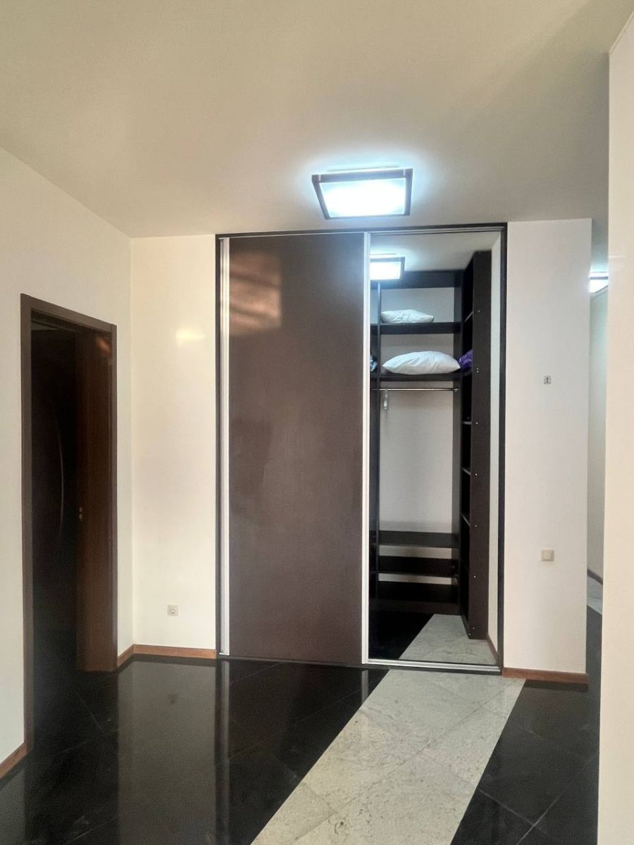 There are living room and three bedrooms: one bedroom with king-size bed, another with big round bed for 2 people and third bedroom with two king-size beds for 4 person. Linen and towels are provided. Three bathrooms.