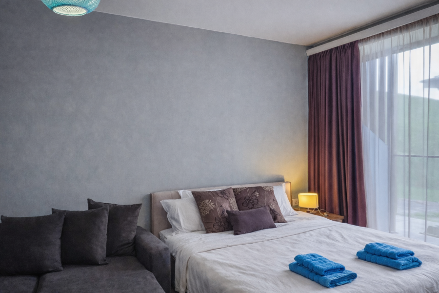 1 комната, 1 двуспальная кровать, 1 диван-кровать для одного взрослого, Постельное белье, Полотенца, Кухня, Холодильник, Чайник, Плита, Микроволновка, Фен, 1 совмещенный санузел с душем, TV, WI-FI, Горный вид, Красивый вид, Балкон, Французкое окно, В номере не курят, Возможно самостоятельное заселение (по коду на двери)