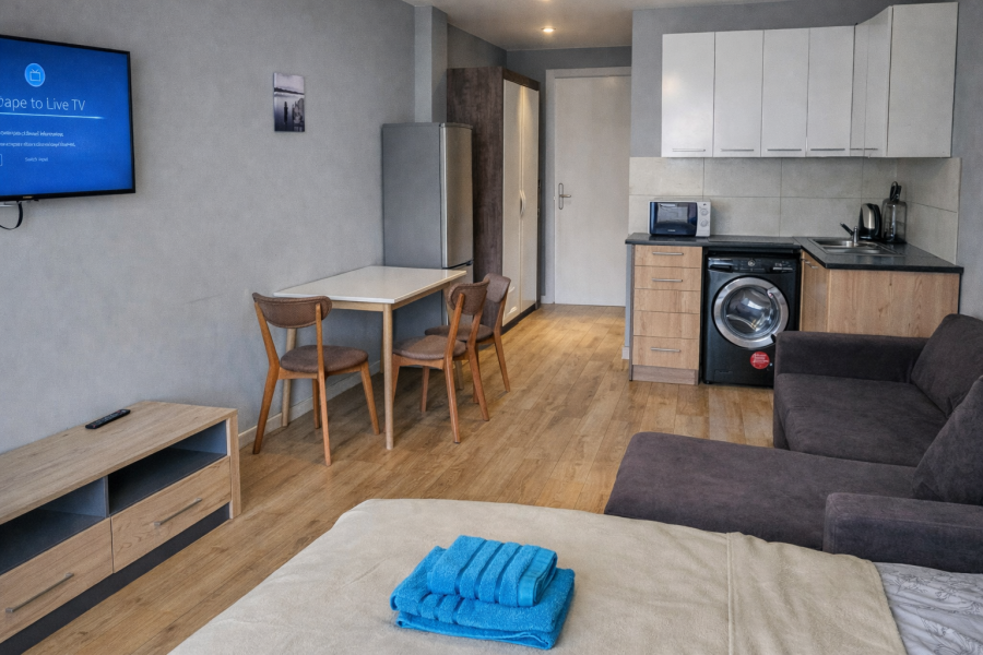 1 комната, 1 двуспальная кровать, 1 диван-кровать для двух взрослых, Постельное белье, Полотенца, Кухня, Холодильник, Чайник, Плита, Микроволновка, Стиральная машина, Фен, 1 совмещенный санузел с душем, TV, WI-FI, Балкон, Французкое окно, В номере не курят, Возможно самостоятельное заселение (по коду на двери)