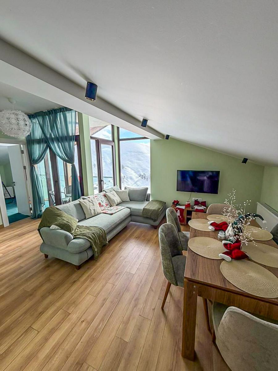 2 комнаты, 1 двуспальная кровать, 1 диван-кровать для двух взрослых, 1 диван-кровать для одного взрослого, Постельное белье, Полотенца, Кухня, Холодильник, Плита, Стиральная машина, Фен, 1 совмещенный санузел с душем, TV, WI-FI, Горный вид, Красивый вид, Балкон, Французкое окно, В номере не курят