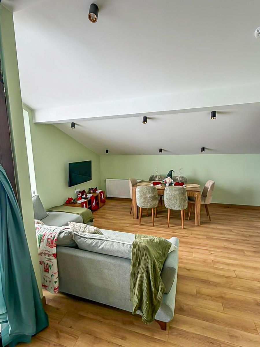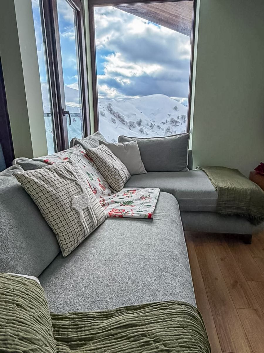 2 комнаты, 1 двуспальная кровать, 1 диван-кровать для двух взрослых, Постельное белье, Полотенца, Мини кухня, Холодильник, Чайник, Стиральная машина, Фен, 1 совмещенный санузел с душем, TV, WI-FI, Горный вид, Французкое окно, В номере не курят
