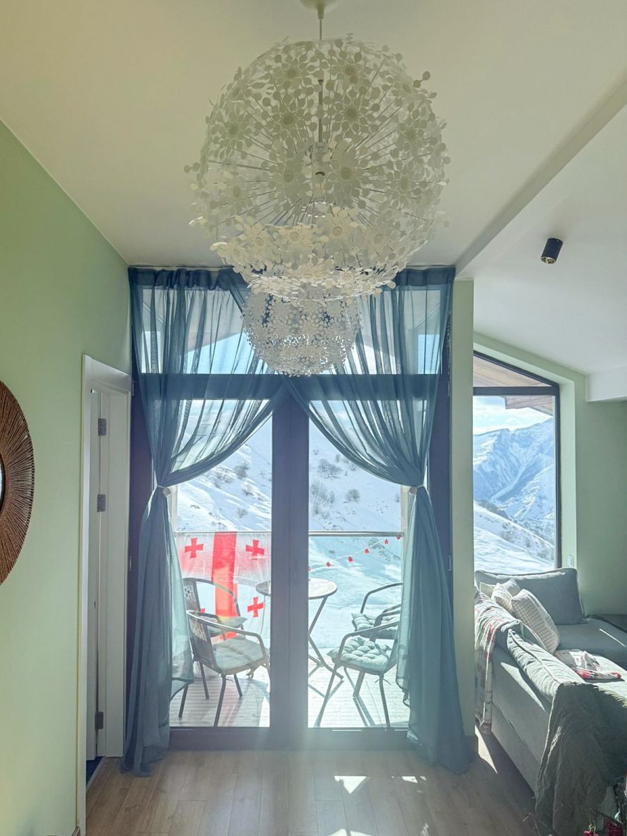 1 комната, 1 двуспальная кровать, 1 диван-кровать для двух взрослых, Постельное белье, Полотенца, Кухня, Холодильник, Чайник, Плита, Микроволновка, Фен, 1 совмещенный санузел с душем, TV, WI-FI, Горный вид, Красивый вид, Французкое окно, В номере не курят, Возможно самостоятельное заселение (по коду на двери)